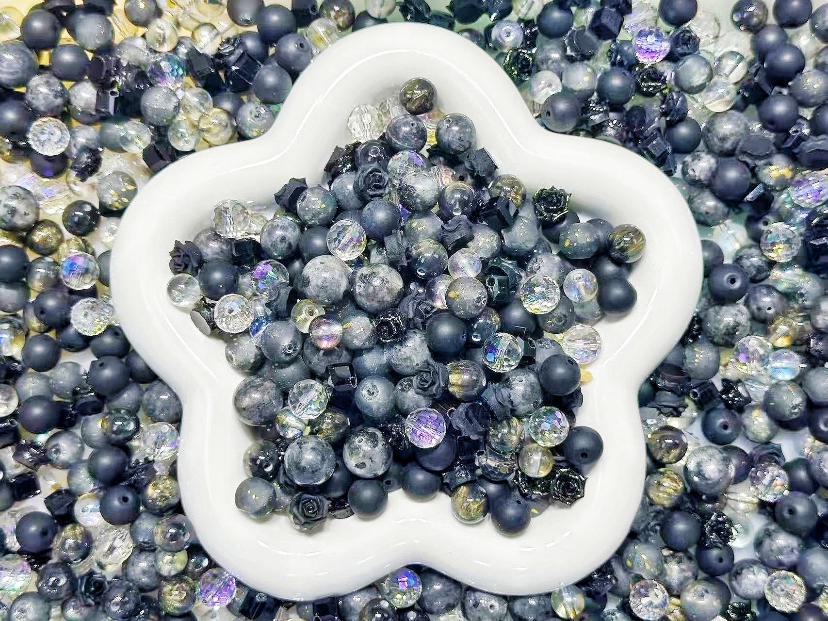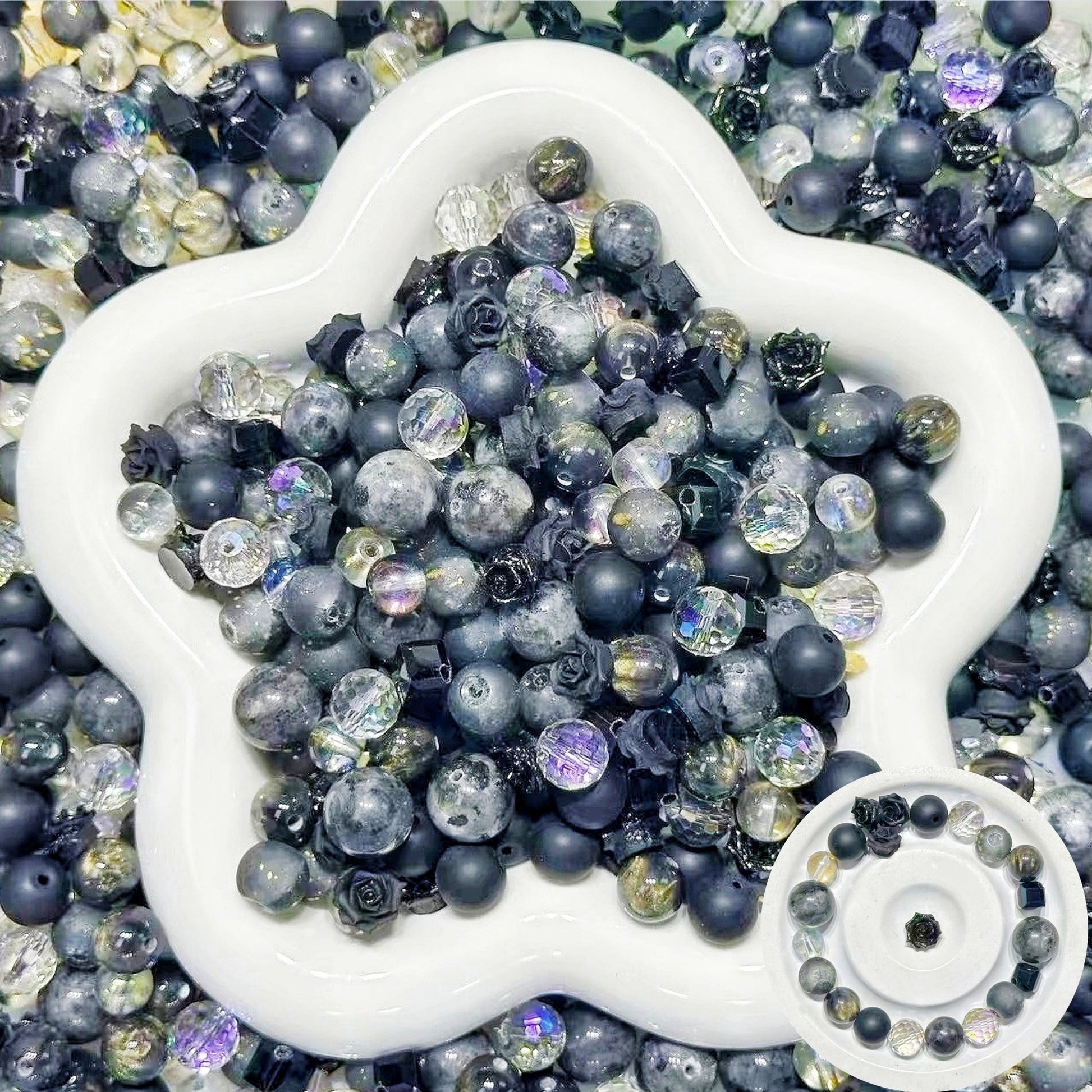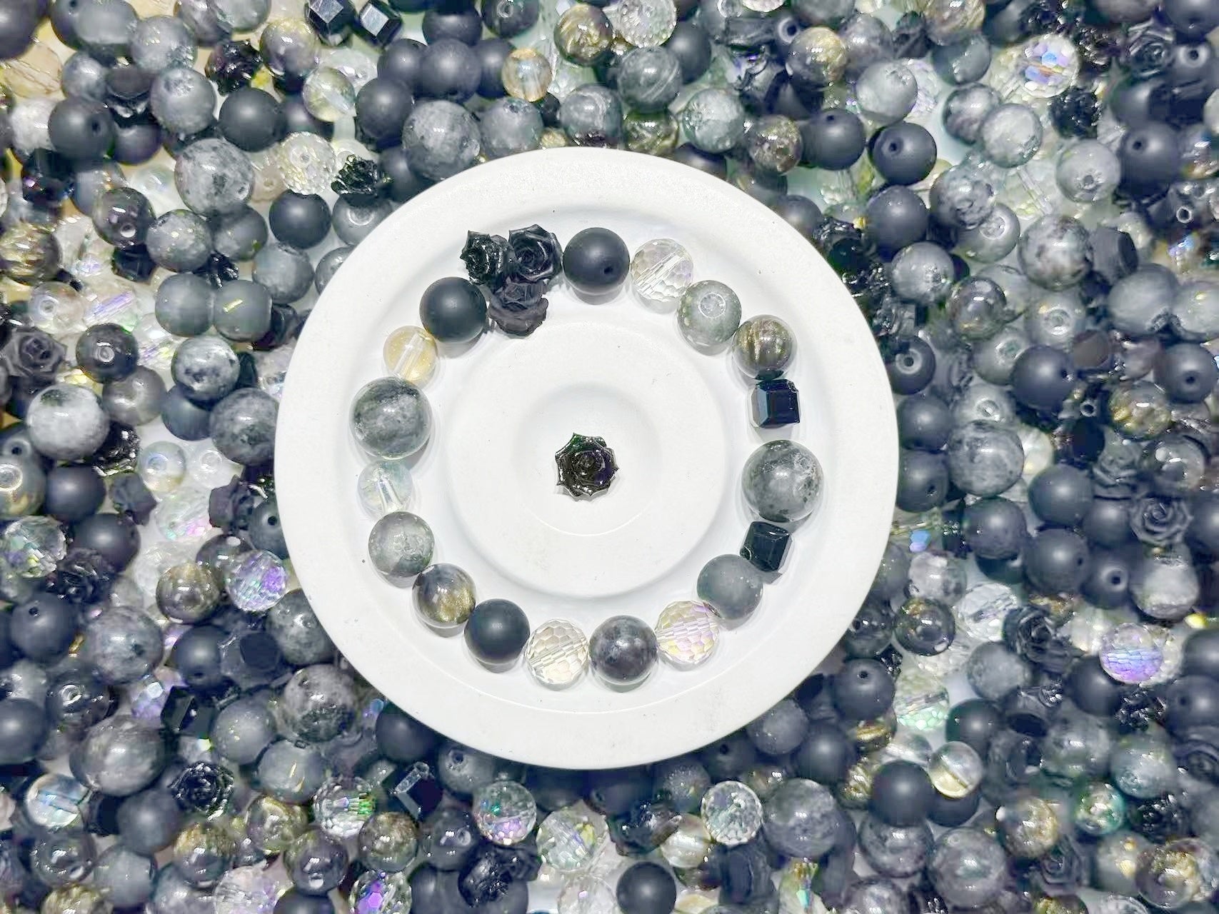 3.5NEW【B130】闇の閃光(ラブラドライト10mmと12mm、ソフトバラ2種類、レジン1種類、高品質ガラスビーズ3種類とガラス多面カット1種類)
