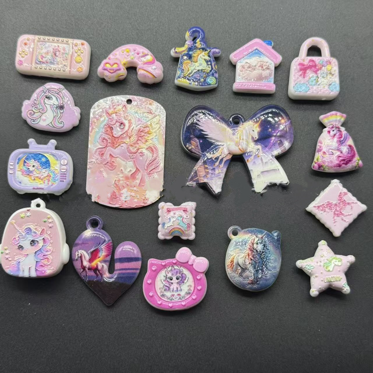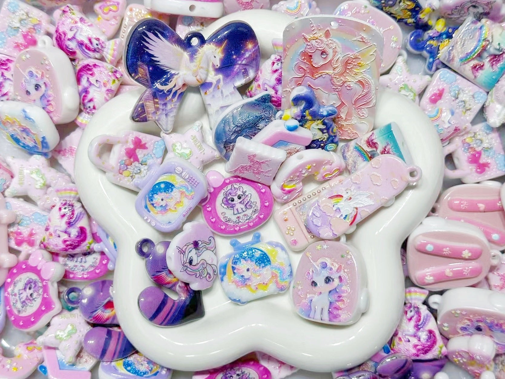 2.27NEW【A467】空へゆくユニコン(浮き彫りプリントビーズ約14種類とプレート1種類とリボンパーツ1種類、普通ビーズなし)